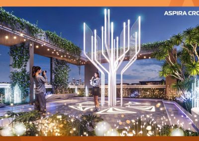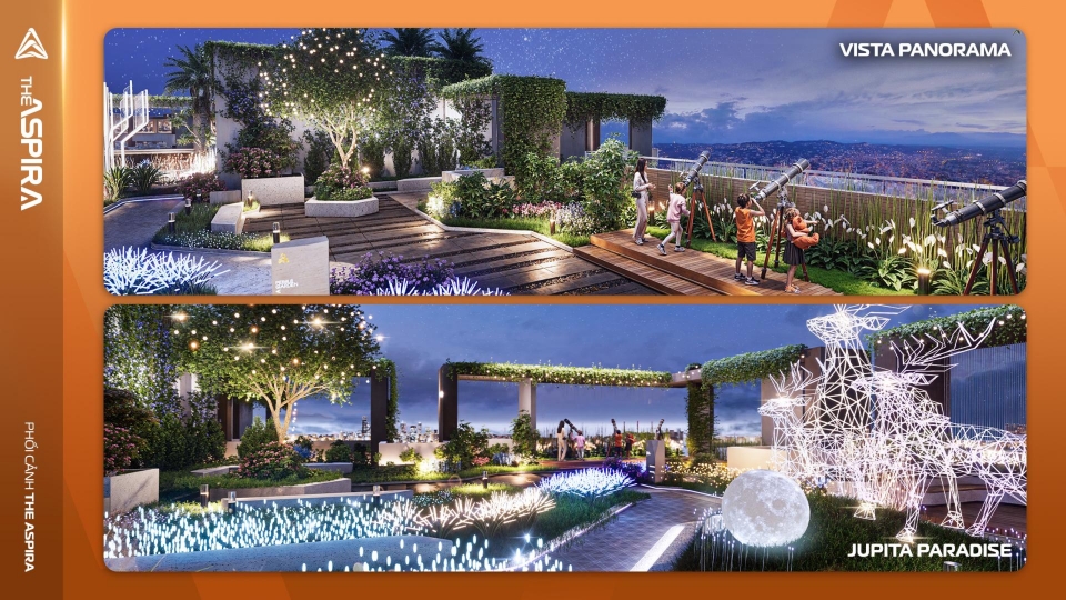 The Aspira sở hữu hệ tiện ích tầng thượng đa dạng và độc đáo tại phía Đông Bắc Sài Gòn. Lấy cảm hứng và mang nguồn năng lượng của các vì sao, không gian trên cao tại The Aspira được kiến tạo theo hành trình ánh sáng từ Đông sang Tây, từ bình minh đến màn đêm rực rỡ – kiến tạo nên một vòng tròn tận hưởng bất tận, đánh thức mọi giác quan và cảm xúc. Ngày đốt năng lượng với đại sảnh nhiệt năng, sáng tạo tại vườn mơ mây treo; trưa lại có tiện ích vui chơi náo nhiệt với khu vui chơi trẻ em, khu vui chơi nước; tối dạo chơi vườn ánh sáng, phóng tầm mắt vào thiên hà diệu kỳ tại đài vọng cảnh.